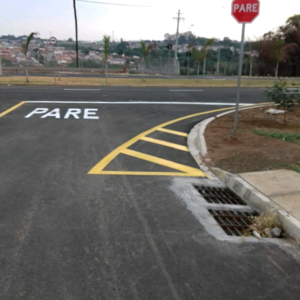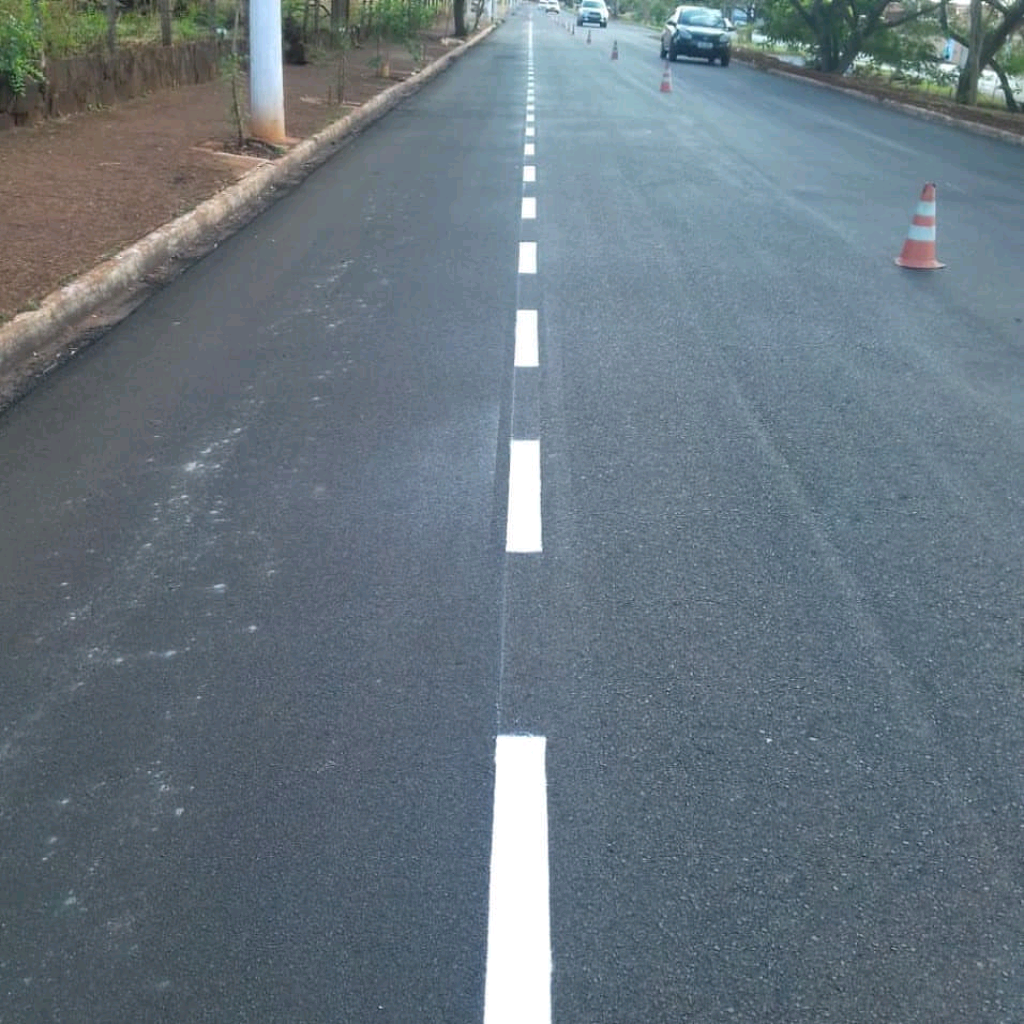 A aplicação da pintura é feita com máquinas de demarcação viária calibradas para garantir: