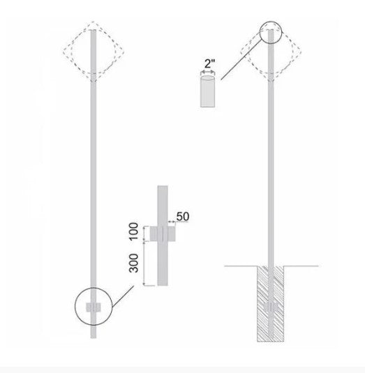 Com diâmetro de 2" (5,08 cm) ou 2 ½" (6,35 cm) e opções de 3,0 m ou 3,5 m de comprimento , este poste é perfeito para placas de até 100 cm de largura .